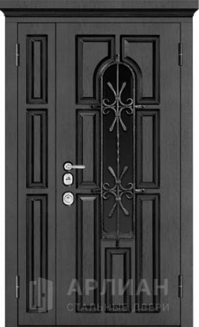 Двухстворчатая входная дверь со стеклом и ковкой №9